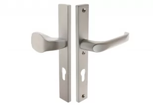 Klamka drzwiowa z pochwytem wykonana ze znalu - stopu cynku i aluminium, stosowana w drzwiach aluminiowych, PVC i wszędzie tam, gdzie z przyczyn kontrukcyjnych wymagany jest wąski szyld klamki (32 mm). Przeznaczona do drzwi o grubości maksymalnej 80 mm. Podana cena obejmuje pochwyt na stronę zewnętrzną i klamkę na stronę wewnętrzną drzwi.