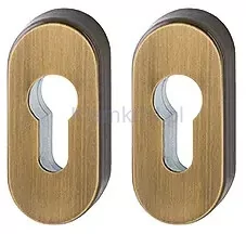Komplet solidnych rozet do drzwi wejściowych na wkładkę z mosiądzu: Model: M55S-SR Kolor: mosiądz brązowiony F73 Konstrukcja wewnętrzna: od zewn. mosiądz, od wewn. stalowa, czopy stabilizujące Mocowanie: