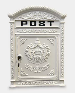 Skrzynka na listy w stylu vintage z napisem POST, w kolorze białym. Bogato zdobiona w greckie ornamenty geometryczne oraz wizerunek aniołków. Skrzynka jest wykonana z aluminium. Można ją zamontować zarówno na ścianie jak i na ogrodzeniu za pomocą śrub lub haków. Wrzut standardowych rozmiarów.