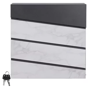 1 x skrzynka na listy 1 x zestaw montażowy 2 x klucze Dane techniczne: Materiał: stal Kolor: antracyt, wygląd marmuru Wymiary (LxWxH): ok. 37 x 36,5 x 11 cm Otwór na wkładkę (dł. x szer.): 33,5 x 3,5 cm Wysokość klapy: