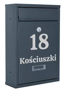 Skrzynka na listy GUSTAV antracyt z napisem Kolor: antracyt Praktyczna skrzynka pocztowa ze stali galwanizowanej malowanej proszkowo. Nowoczesny i ponadczasowy styl obok którego nie można przejść obojętnie. Skrzynka oprócz podstawowych funkcji, będzie cieszyć oko, a także wzbudzi zazdrość Twoich sąsiadów! Wykonana z wysokiej jakości materiałów odpornych na warunki atmosferyczne, dzięki czemu wszelka korespondencja jest bardzo dobrze zabezpieczona. Produkt spersonalizowany Możliwość wykonania dowolnego napisu: