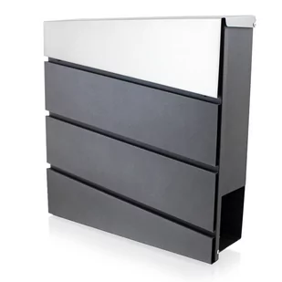 Wymiary (szer./wys./gł.): 370 x 370 x 110 mm, Wymiary przegródki na gazety (szer./wys./gł.): 370 x 90 x 80 mm, Wymiary wrzutu: 335 x 35 mm, Kolor: grafit i stal nierdzewna, Materiał: