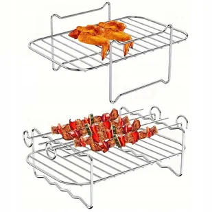 ✨[WSZECHSTRONNE ZASTOSOWANIE]: To akcesorium do frytkownicy powietrznej świetnie nadaje się do przygotowywania frytek, krążków cebulowych, pasków kurczaka, grillowanych warzyw, pizzy, krakersów, ryb, paluszków mozzarelli, wieprzowiny, parówek w cieście, krewetek, brokułów i wielu innych potraw o lepszym smaku. ✨[WYGODNY I ZDROWY]: Ruszt do grillowania parowego pozwala maksymalnie wykorzystać przestrzeń pionową we frytkownicy, co jest idealne do grillowania kurczaka, steków, warzyw, hamburgerów itp. Ruszt na szpikulce z 4 szpikulcami jest idealny do pieczonych warzyw, szaszłyków mięsnych i parówek.