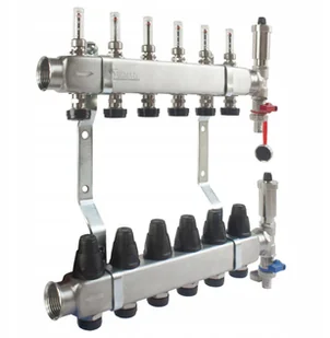 Rozdzielacz ze stali nierdzewnej INOX 14-drogowy z przepływomierzami, zaworami termostatycznymi, zaworami spustowymi i odpowietrznikami automatycznymi