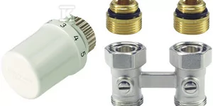 Zestaw do grzejników dolnozasilanych składający się z: - Głowicy termostatycznej Thera-6 T3019, nastawa 6-28oC Thera-6 to głowica o kompaktowych rozmiarach, gładkiej powierzchni, energooszczędna i trwała. - Zaworu podwójnego prostego, 2-rur., z odcięciem, 1/2" V2495DY015 Zawór podwójny odcinający z uszczelnieniem stożkowym, z rozstawem montażowym 50 mm jest stosowany w grzejnikach kompaktowych w instalacjach 2-rurowych systemów grzewczych. Zawory współpracują z grzejnikami z wyjściem 3/4" gw. zewnętrzny lub 1/2" gw. wewnętrzny i posiadają tylko funkcję odcięcia. Do wodnych instalacji grzewczych.