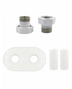 Zestaw maskujący rozety + tuleje + złączki GZ1/2 x GW3/4 Skład zestawu: 1 rozeta podwójna o rozstawie 50mm 2 tuleje 2 złączki GZ 1/2 x GW dopasowane m. in. do zaworów: TWINS/UNICO Właściwości zestawu: rozeta zespolona - owalna rozeta i tuleje metalowe średnica otworów rozety Ø 22 mm do zaworów o rozstawie przyłączy 50 mm złączka/adapter zaciskowy GZ1/2 x GW " - z łączka przeznaczona jest do połączenia zaworów z instalacją 1/2 GW WARTO WIEDZIEĆ Rozeta najczęściej stosowana w zestawie z zaworami Twins i Unico firmy Vario Term - stosowanych jako zawory o rozstawie 50 mm Poniżej zamieszczamy rysunek z wymiarami rozety i tulei.