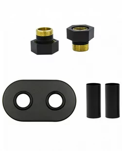Zestaw maskujący rozety + tuleje + złączki GZ1/2 x GW3/4 Skład zestawu: 1 rozeta podwójna o rozstawie 50mm 2 tuleje 2 złączki GZ 1/2 x GW dopasowane m. in. do zaworów: TWINS/UNICO Właściwości zestawu: rozeta zespolona - owalna rozeta i tuleje metalowe średnica otworów rozety Ø 22 mm do zaworów o rozstawie przyłączy 50 mm złączka/adapter zaciskowy GZ1/2 x GW " - z łączka przeznaczona jest do połączenia zaworów z instalacją 1/2 GW WARTO WIEDZIEĆ Rozeta najczęściej stosowana w zestawie z zaworami Twins i Unico firmy Vario Term - stosowanych jako zawory o rozstawie 50 mm Poniżej zamieszczamy rysunek z wymiarami rozety i tulei.