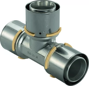 Uponor Press trójnik Wykonany z mosiądzu powlekanego cyną, z przymocowanymi tulejami zaciskowymi, kolorowe pierścienie oporowe oraz test próby szczelności. Zaprasowanie bez fazowania.
