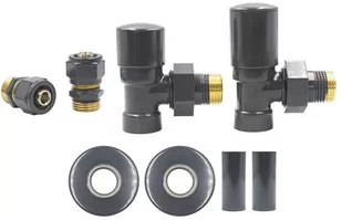Komplet zaworów kątowych SWING, składa się z zaworu regulacyjnego bez głowicy termostatycznej i zaworu odcinającego, dwóch pojedynczych rozet lub jednej rozety zespolonej (owalnej lub prostokątnej), dwóch tulei oraz dwóch przejściówek/złączek do instalacji miedzianej 15 mm lub alu-pex 16 mm - typ złączki jedna wersja do wyboru oraz kształt i rodzaj rozety również jedna opcja do wyboru. Zawory dedykowane są zarówno do instalacji miedzianych o średnicy 15 mm, jak również do instalacji typu alu-pex o średnicy 16 mm. Spośród dostępnych opcji należy wybrać komplet z przejściówką pasującą do Państwa instalacji.