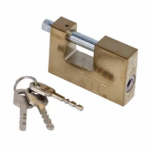 Kłódka z mechanizmem zatrzaskowym KSS. Korpus żeliwny pokryty lakierniczą powłoką proszkową, pałąk wykonany ze stali hartowanej pokryty powłoką cynkową. Bębenek mosiężny. W komplecie 3 klucze.