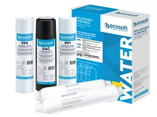 Ecosoft zestaw 5 wkładów wymiennych do filtra odwróconej osmozy. W skład zestawu wchodzą następujące wkłady: filtr polipropylenowy, wkład węglowy, wkład z włókniny polipropylenowej 5 μm, wkład mineralizujący oraz filtr szlifujący.