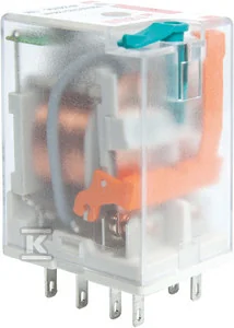 Przekaźnik elektromagnetyczny, przemysłowy - miniaturowy, do gniazda wtykowego. Szerokość 21,2 mm. Wyjście: 2P - dwa zestyki przełączne - wyprowadzenia: 11(9)-12(1)-14(5), 41(12)-42(4)-44(8), AC1 - 12 A / 250 V, DC1 - 12 A / 24 V. Wejście / cewka - wyprowadzenia: