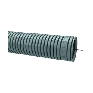 Rura instalacyjna, karbowana, giętka, z pilotem, nie rozprzestrzeniająca płomienia - rura samoczynnie gaśnie w określonym czasie po usunięciu płomienia. Średnica zewnętrzna rury karbowanej ma 25 mm, a wewnętrzna 19 mm. Minimalna wytrzymałość na nacisk wynosi 320 N/5cm. Rura przeznaczona jest do ochrony i prowadzenia izolowanych przewodów elektrycznych lub telekomunikacyjnych w systemach instalacji do 1000V prądu przemiennego. Wykonana z PCV w kolorze szarym (RAL 7035).