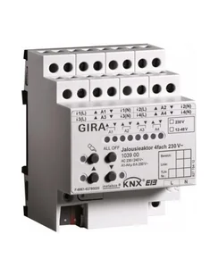Aktor żaluzjowy KNX Gira 4-kanałowy AC 230 V DC 12 - 48 V z obsługą ręczną Aktory żaluzjowe REG plus ze zintegrowanym sprzęgłem magistralnym, obsługą ręczną i wskaźnikiem stanu dla każdego wyjścia. Do sterowania elektrycznie sterowanymi żaluzjami, roletami, markizami, klapami wentylacyjnymi lub podobnymi podwieszeniami.