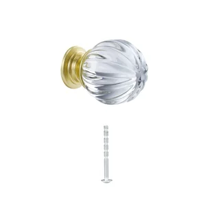 Gałka meblowa Emy o średnicy 29 mm to elegancki element wykończeniowy, który łączy w sobie klasyczną formę i nowoczesny design. Jej okrągła forma z mosiężną podstawą w gładkim połysku oraz szklaną głowicą wyróżnia się subtelnym blaskiem, który przyciąga wzrok. Charakterystycznym akcentem jest nacięty wzór na szklanej głowicy, inspirowany delikatnymi detalami. Dzięki tej finezyjnej dekoracji, gałka doskonale wpisuje się w eleganckie wnętrza, nadając im wyjątkowego charakteru. Idealna do mebli, które wymagają subtelnego, lecz efektownego wykończenia.