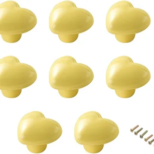 Zawartość opakowania: 8 ceramicznych uchwytów do szuflad w kształcie serca, w kolorze żółtym, z 8 śrubami, ceramiczne uchwyty 40 x 36 x 30 (mm), długość śruby 25 mm, grubość panelu do montażu nie powinna przekraczać 20 mm.