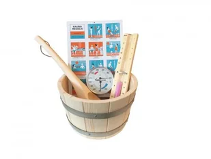 Balíček dodatków i akcesoriów do twojej sauny. Termometr, zegar saunowy, chochla do wody, wiadro.