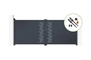 Ten zestaw bram z napędem zawiera: Brama skrzydłowa designerska ARLBERG w kolorze szarym Szerokość 350 cm, wysokość 145 cm Silnik cylindryczny premium (700 kg)