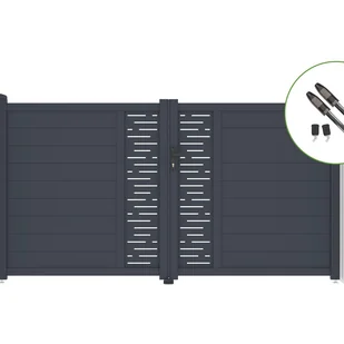 Ten zestaw bram z napędem zawiera: Brama skrzydłowa designerska ARLBERG w kolorze szarym Szerokość 300 cm, wysokość 161 cm Silnik cylindryczny premium (700 kg)