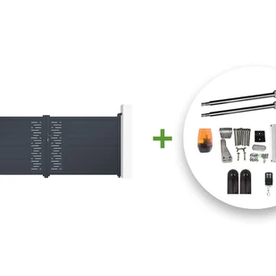 Ten zestaw bram z napędem zawiera:Brama skrzydłowa designerska ARLBERG w kolorze szarymSzerokość 350 cm, wysokość 145 cmSilnik siłownika (do 600kg)Casanoov specjalizuje się w bramach i furtkach KIT do samodzielnego montażu i samod