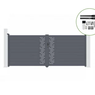 Ten zestaw bram z napędem zawiera:Brama skrzydłowa designerska ARLBERG w kolorze szarymSzerokość 392 cm, wysokość 161 cmNapęd ślimakowy (do 400kg)Casanoov specjalizuje się w bramach i furtkach KIT do samodzielnego montażu i samodz