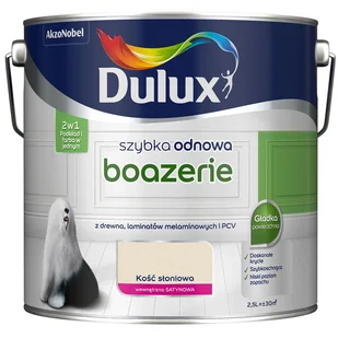 Dulux Szybka Odnowa Boazerie kość słoniowa 2,5 L Dulux Szybka Odnowa jest nowoczesną linią uniwersalnych farb do malowania różnych powierzchni w domu. Idealnie nadaje się do szybkiej renowacji i nadania nowego blasku ulubionym przedmiotom. Dulux Szybka Odnowa BOAZERIE to wodorozcieńczalna farba do renowacyjnego malowania lakierowanych wcześniej boazerii, paneli ściennych zarówno drewnianych jak i pokrytych laminatami melaminowymi oraz PCV. Farba przeznaczona jest do stosowania wewnątrz pomieszczeń. Jest łatwa w użyciu, ponieważ nie potrzebujesz podkładu.