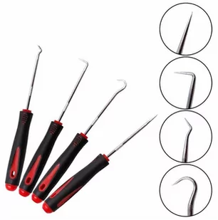 Zestaw 4 uniwersalnych haczyków narzędziowych do uszczelek i oringów. Ułatwiają podważanie, przeciąganie i manipulację trudno dostępnymi elementami gumowymi. Poręczne uchwyty pozwalają na łatwe operowanie każdym z haczyków. Solidna, hartowana stal umożliwia długie i bezproblemowe użytkowanie. Materiał: stal hartowana + PP/TPR (rękojeść) Twardość: