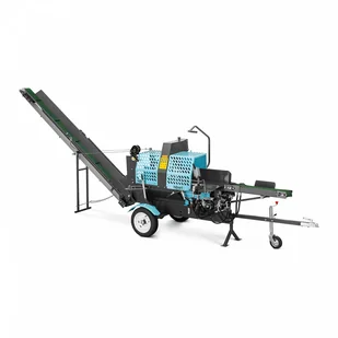 Przenośnik taśmowy rozładowuje gotowe drewno opałowe w ostatnim kroku. Jeden cykl trwa tylko 7 s! W zależności od rodzaju i grubości kłód, piło-łuparka do drewna może wyprodukować do 4 m³/h surowca. Automatyczna piło-łuparka produkuje drewno opałowe o długości 530 mm i średnicy 50-300 mm. Urządzenie wyposażono w duże gumowe koła umożliwiające łatwy i bezpieczny transport. W celu bezpiecznego użytkowania zalecamy noszenie odpowiedniej odzieży ochronnej.