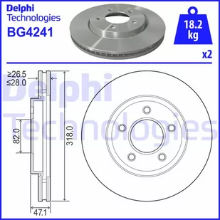 Typ tarczy hamulcowej: wentylowany Średnica [mm]: 318,3 Grubość tarczy hamulcowej [mm]: 28 Minimalna grubość [mm]: 26,5 Średnica otworu centrującego [mm]: