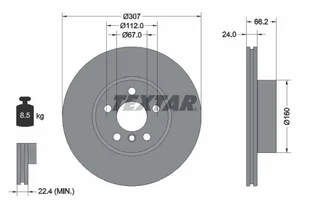 Typ tarczy hamulcowej: z wentylacją wewnętrzną średnica zewnętrzna [mm]: 307 Grubość tarczy hamulcowej [mm]: 24 Wysokość [mm]: 66,2 Minimalna grubość [mm]: