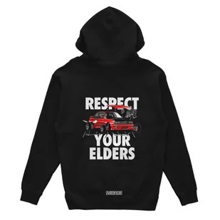 Czarna bluza z kapturem RESPECT YOUR ELDERS Jeśli jesteś prawdziwym entuzjastą motoryzacji i kochasz klimat jdm, stance i drift, ta czarna bluza z kapturem j...