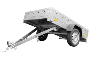 Szeroka przyczepa towarowa o wymiarach 200 x 125 cm. Model Garden Trailer 201 Kipp z uchylnym dyszlem i DMC do 750 kg. Jest to przyczepa na kategorię B, która pozwoli Ci szybko i wygodnie przewieźć najróżniejsze towary.