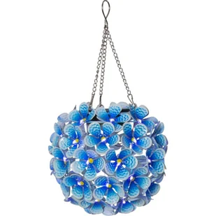 DEKORACJA OGRODOWA LED SOLARNA Piękna dekoracja ogrodowa w kształcie niebieskiego kwiatu hortensji, wyposażona w metalowy łańcuszek do zawieszenia. Płatki wy...