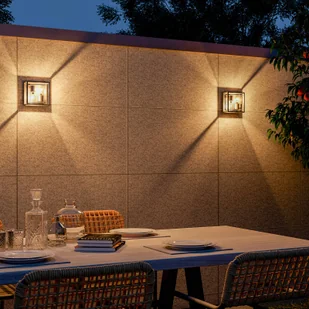 Modna zewnętrzna lampa ścienna w kształcie czarnego prostopadłościanu z dwiema oprawami Ta zewnętrzna lampa ścienna to stylowe źródło światła, które szczególnie efektownie prezentuje się w nowoczesnych wnętrzach. Skierowana w dół oprawa E27 i skierowana w górę oprawa E27 są umieszczone obok siebie za przezroczystą osłoną z poliwęglanu. Płyta ścienna i otwarta, prostopadłościenna konstrukcja zewnętrzna są wykonane z aluminium i wykończone w kolorze czarnym - Stopień ochrony: IP44
