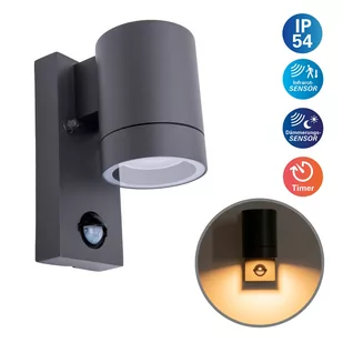 Zewnętrzna lampa ścienna Rombe z czujnikiem, wiązka w dółZewnętrzna lampa ścienna Rombe z aluminium malowanego proszkowo w kolorze antracytowym emituje swoje światło w dół i jest wyposażona w czujnik na uchwycie ściennym. Czujnik wykrywa ruch pod kątem 120° i w odległości 8-10 metrów, a następnie automatycznie włącza światło.