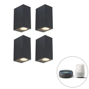 Lamp includes a dimmer,Nie, bez przewodu i wtyczki Odkryj Baleno, zestaw 4 inteligentnych lamp ściennych, które wdoskonały sposób łączą nowoczesną technologię ze stylem. Każda ztych czarnych, prostokątnych lamp ma dwa punkty świetlne GU10 ijest wyposażona w8 żarówek Wifi GU10, które można łatwo sterować za pomocą aplikacji. Lampy są ściemniane imogą przyjmować różne temperatury barwowe od 1800 K do 6500 K, co pozwala stworzyć idealną atmosferę. Lampy mają 9cm głębokości, 15cm wysokości i6,5cm długości. 4 inteligentne lampy ścienne mają klasę szczelności IP44, co czyni je odpowiednimi do użytku na zewnątrz.