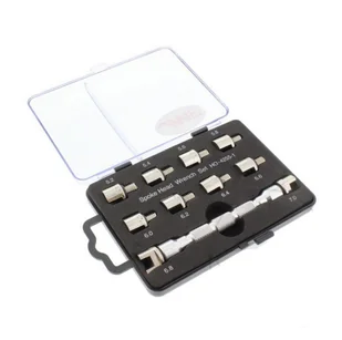Poręczny zestaw kluczy do szprych w praktycznym pudełku. Zawiera rękojeść oraz 10 wkręcanych adapterów