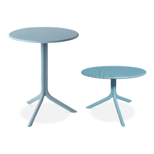 Okrągły stolik Step Celeste projektu włoskiej marki NARDI to doskonały wybór do każdej aranżacji tarasu lub ogrodu. Również idealny na małe balkony. Wykonany jest z wysokiej jakości polipropylenu z dodatkiem włókna szklanego, co gwarantuje odporność na zmienne warunki atmosferyczne. Stabilność stolika zapewniają trzy rozstawione nóżki zakończone antypoślizgowymi stopkami oraz ciężarek zamontowany w dolnej części. Wyjmowana rama umożliwia wybór wysokości 76,5 cm lub 40 cm, dzięki czemu można z niego korzystać wersji bistro i jak z niskiego stolika kawowego.