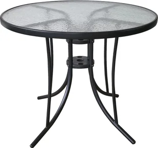Stolik ogrodowy, metalowy ze szklanym blatem, 70x90 cm Wysokość: 70 cm Średnica: 90 cm Kolor: czarny Blat stolika - grube szkło Stelaż stolika - stal Funkcja składania - nie Kształt okrągły .