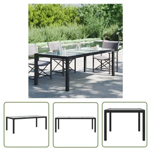Po opadach deszczu lub śniegu należy wytrzeć i wysuszyć nadmiar wody lub śniegu z płaskiej powierzchni. Zapewnij odpowiednią cyrkulację powietrza, aby zapobiec uszkodzeniom związanym z wilgocią. Kolor: czarnyMateriał: polirattan, stal malowana proszkowo, szkło hartowaneWymiary stołu: 190 × 90 × 75 cm (dł. × szer. × wys.)Grubość szkła: