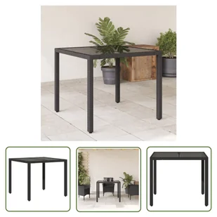Stół ogrodowy ze szklanym blatem czarny 90x90x75 cm z polirattanuDzięki czystym liniom i prostemu wzornictwu, ten stół ogrodowy ze szklanym blatem jest doskonałym wyborem do ogrodu, patio i innych obszarów zewnętrznych. Wytrzymały materiał: rattan PE, znany również jako polirattan, to wytrzymały, łatwy w pielęgnacji materiał syntetyczny o wyglądzie naturalnego rattanu. Charakteryzuje się niską wagą i jest łatwy w czyszczeniu. Ze względu na swoją trwałość i odporność na warunki atmosferyczne jest często wykorzystywany do produkcji mebli ogrodowych.