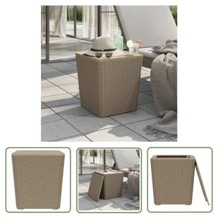 Gdy pokrywa jest zamknięta jako blat stołu, solidny stolik balkonowy jest idealny do przechowywania telefonu komórkowego, książek, przekąsek lub napojów pod ręką. Uwaga: Aby meble ogrodowe zachowały swój wygląd przez długi czas, zalecamy zabezpieczenie ich wodoodpornym pokrowcem. Kolor: jasnobrązowyMateriał: polipropylen (PP) o wyglądzie rattanuWymiary: 38,5 x 38,5 x 42 cm (szer. x gł. x wys.)Pojemność: