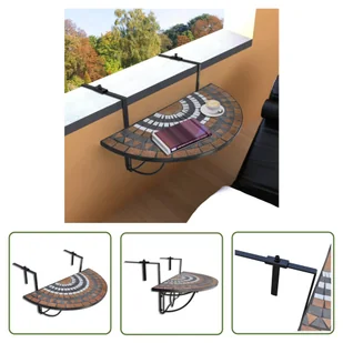 Dzięki półokrągłej konstrukcji ten stolik balkonowy jest wyjątkowo stylowy i praktyczny. Wiszący stolik jest z pewnością świetnym dodatkiem do Twojego balkonu. Na tym uroczym stoliku kawowym można umieścić napoje i przekąski w zasięgu ręki. Żelazny wspornik zwiększa wytrzymałość, a półokrągły blat z ceramiczną mozaiką jest łatwy do czyszczenia. Ten stolik balkonowy można przymocować do dowolnej balustrady tarasu lub balkonu (maks. grubość 18 cm).