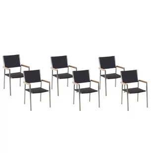 Nowoczesne sztaplowane krzesła do ogrodu Ponadczasowy, komplet 6 krzeseł doskonale sprawdzi się w ogrodzie, na balkonie i trasie. Wykonany z odpornej na warunki atmosferyczne stali nierdzewnej będzie służył przez wiele lat. Siedzisko i oparcie krzeseł z czarnego, syntetycznego rattanu zapewniają wyjątkowy komfort, a eleganckie podłokietniki z imitacji drewna chronią przed zimną metalową ramą. Współczesny design krzeseł sprawia, że każdy ogród nabierze nowoczesnego charakteru. Dodatkowo możliwość sztaplowania pozwala na łatwe przechowywanie krzeseł.