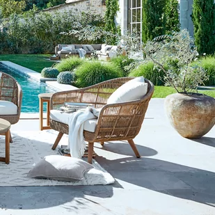 Elegancki komfort siedzenia w stylu retro. Zdejmowane poszewki na poduszki – można je prać, są odporne na promieniowanie UV i trwałe. Nogi z litego drewna akacjowego z woskowanym wykończeniem powierzchni. Najlepszy komfort i nowoczesny styl sprawiają, że ten fotel to idealny dodatek do Twojego przytulnego tarasu i rajskiego ogrodu. Mocna aluminiowa rama i misterna wiklina z polietylenu tworzą zestaw odporny na warunki atmosferyczne.