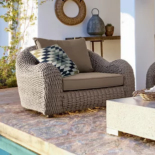 Niepowtarzalny, bezszwowy splot z włókien olefinowych przypominający dzianinę. W zestawie poduszki siedziska oraz dekoracyjne z odpornymi poszewkami z włókiem olefinowych. Elegancki charakter o harmonijnym, zaoblonym kształcie. Ten fotel wypoczynkowy przeznaczony do użytku zewnętrznego jest wprost nadzwyczajny! Siedzisko jest tak miękkie i wygodne, że w niczym nie ustępuje fotelowi w salonie. Ponadto bezszwowo tkany materiał jest odporny na niepogodę, dzięki czemu mebel może stać na zewnątrz przez całe lato.