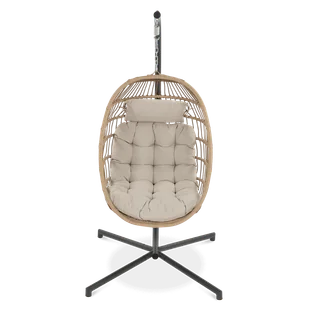 Fotel wiszący ogrodowy HARMONY Beige - FOCUS GARDEN - Odkryj niezwykłą harmonię wypoczynku dzięki fotelowi wiszącemu Focus Garden HARMONY w kolorze beżowym! Nasz fotel to połączenie solidnej konstrukcji i stylowego designu, który przyciąga uwagę każdego miłośnika piękna i wygody. Mocna i stabilna podstawa wykonana jest z wysokiej jakości stali malowanej metodą proszkową, co zapewnia długotrwałą trwałość i odporność na warunki atmosferyczne. Kosz fotela posiada stalowy szkielet opleciony technorattanem, który pełni funkcję ozdobną i ochronną, a specjalna lina poliestrowa gwarantuje bezpieczne użytkowanie. Fotel wyposażony jest w grube i wygodne poduszki na siedzisku oraz zagłówek, które zapewniają dodatkowy komfort i relaks całego ciała. Ergonomiczny profil fotela zapewnia również odpowiednie wsparcie dla kręgosłupa i zapobiega bólowi.
