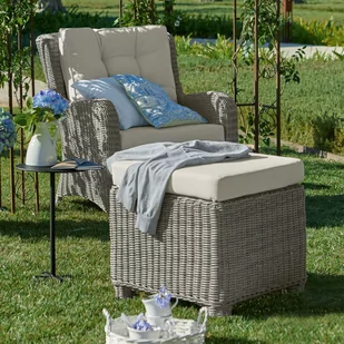 Odporny na warunki pogodowe zestaw składający się z fotela i stołka zaprasza do miłego relaksu. Meble o pięknym, naturalnym uroku doskonale nadają się do użytku w ogrodzie. Stelaże z odpornego na korozję aluminium pokryto starannym splotem z technorattanu. Wysokiej jakości materiał z wyglądu przypomina naturalny rattan, ale jest o wiele bardziej wytrzymały i odporny na warunki atmosferyczne. To samo dotyczy wygodnych poduszek, których poszewki są zdejmowane i można je prać.