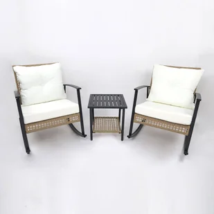 Zestaw 2 foteli bujanych i stolika jest wykonany ze stali i tworzywa sztucznego z efektem rattanu, wysokiej jakości i trwałych materiałów. Krzesła są wyposażone w poduszki na siedziska i oparcia wykonane z gąbki, które można zdejmować.