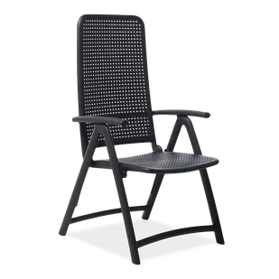 Składany fotel z wysokim oparciem z polipropylenu wypełnionego włóknem szklanym. Tworzywo zostało zabezpieczone dodatkami antystatycznymi oraz anty-UV. Odporne na zmienne warunki atmosferyczne. Wykończenie matowe. Posiada certyfikat CATAS.